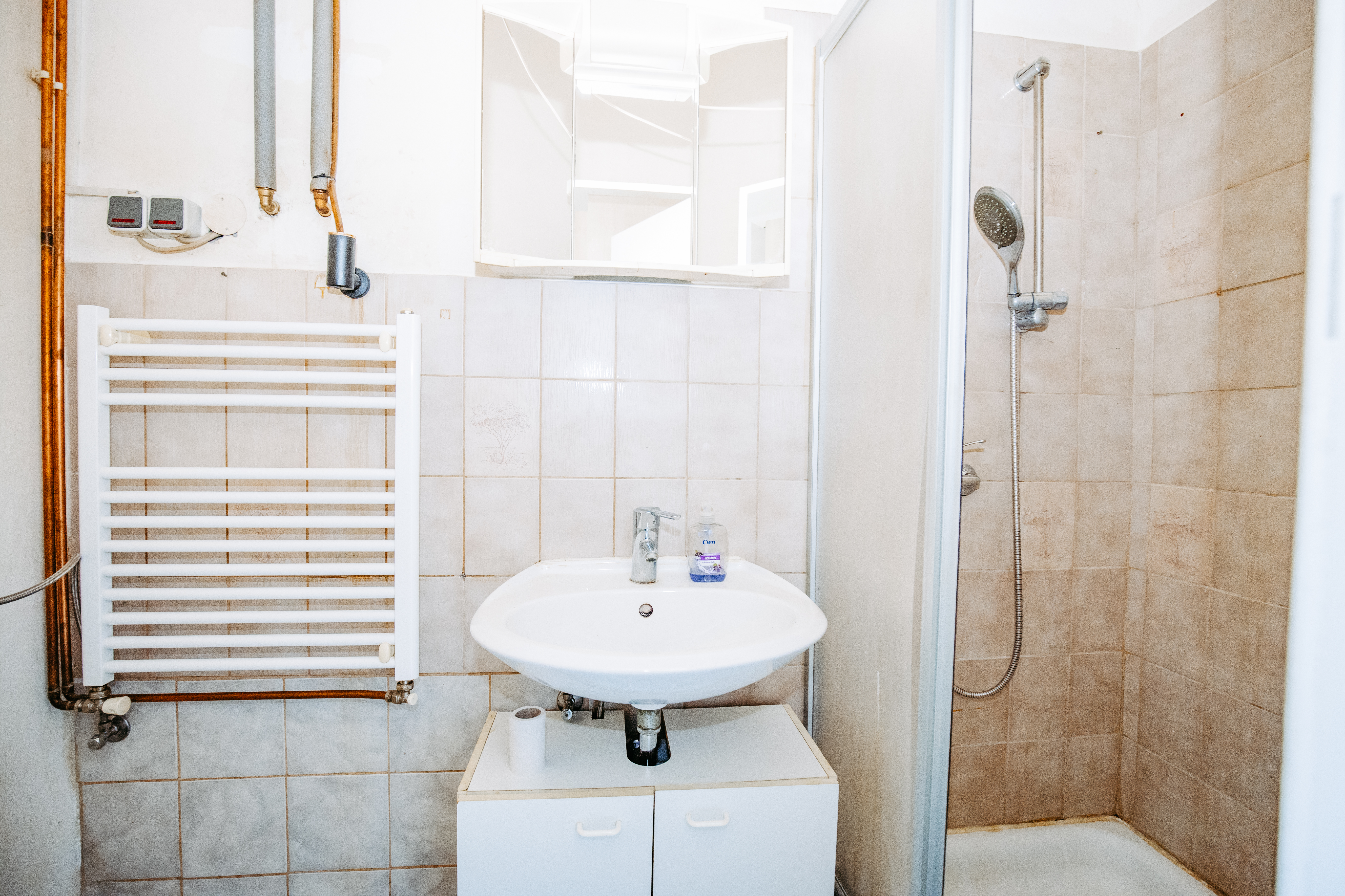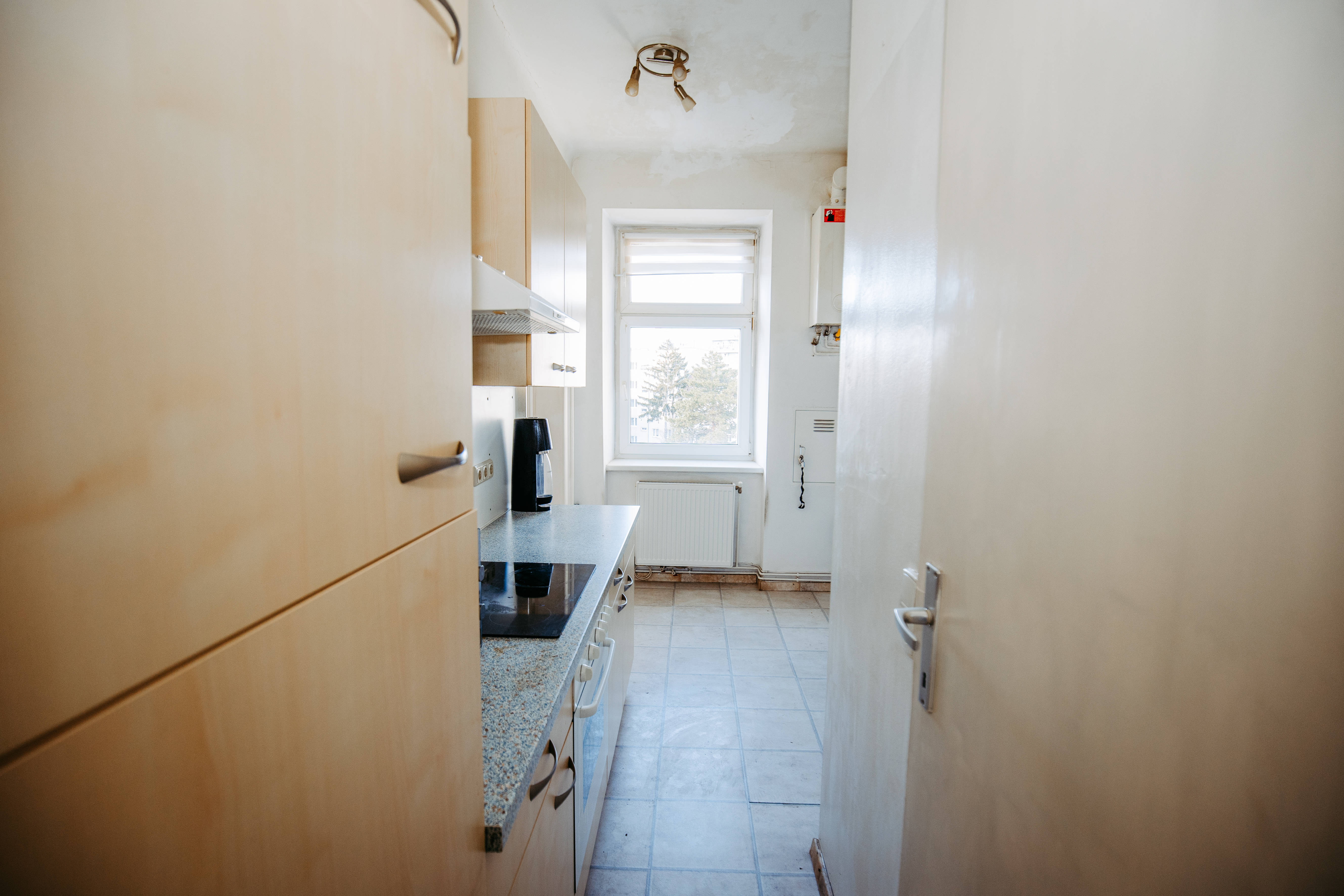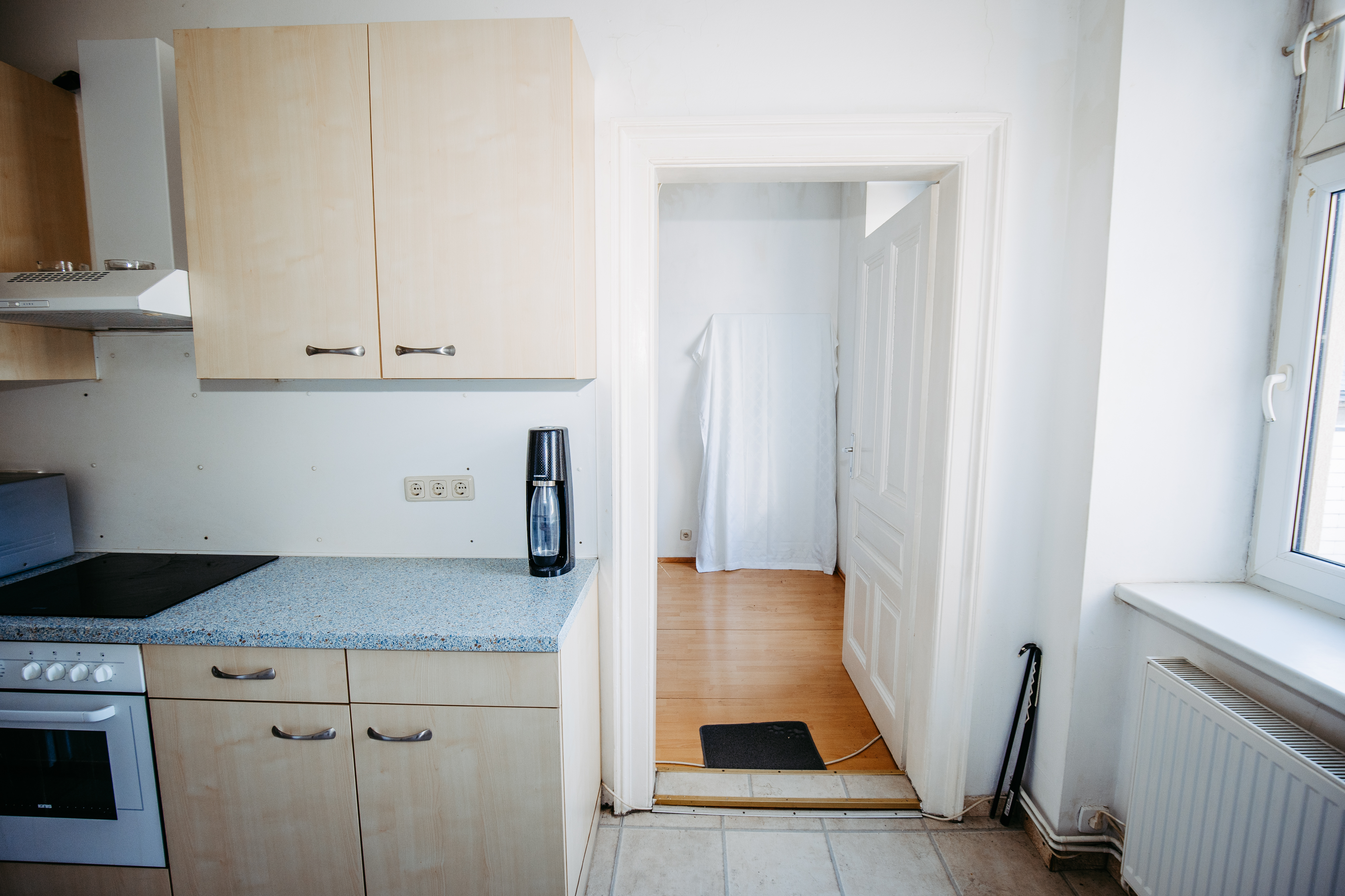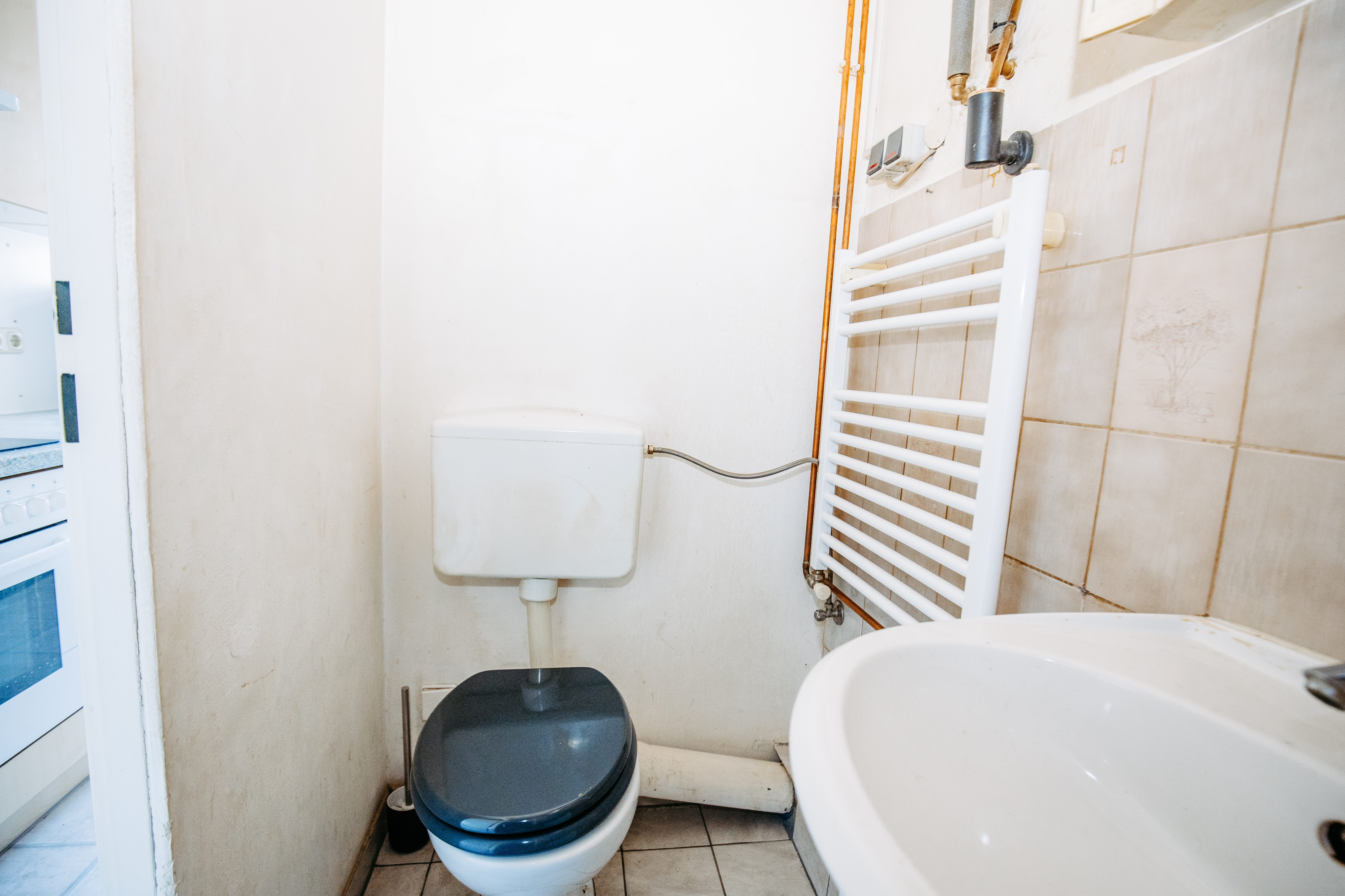 Einbauküche mit Geräten und Waschmaschinenanschluss, Bad mit Dusche und WC