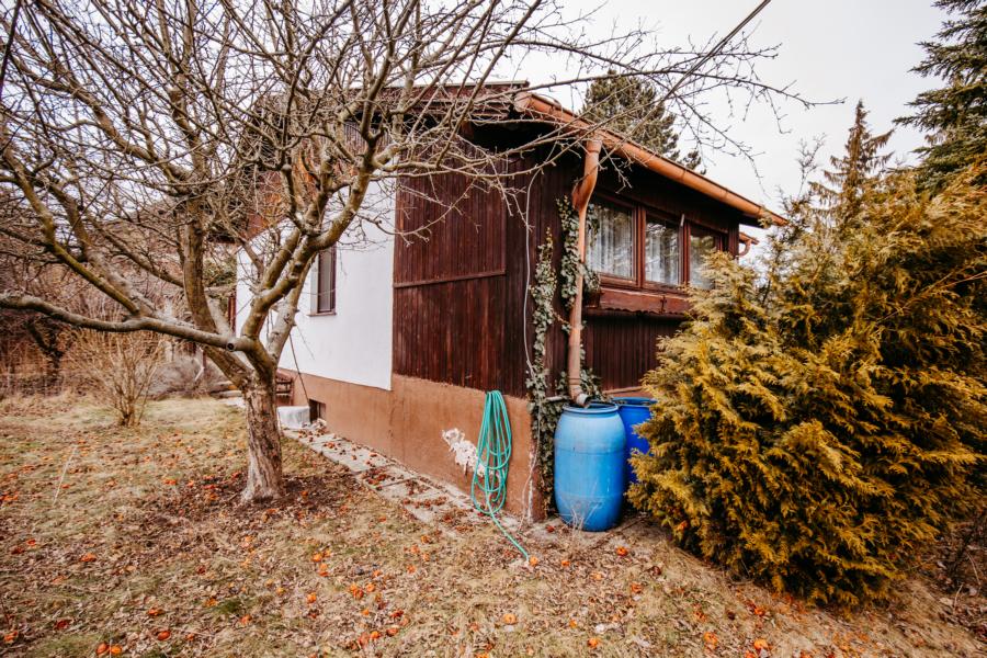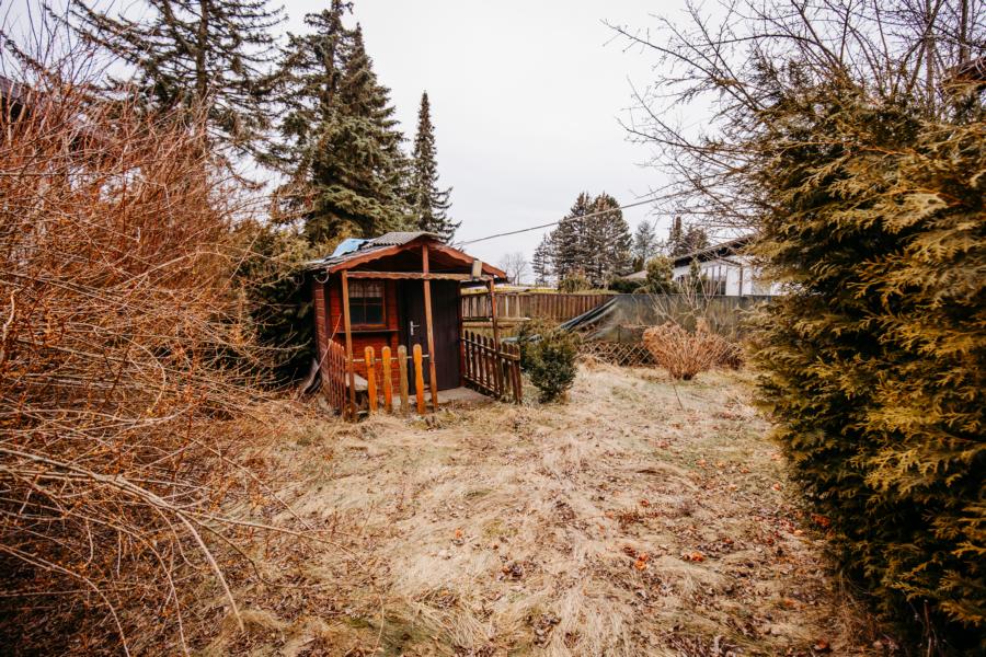 Terrasse, Garten mit Altbaumbestand, Holzgartenhütte.