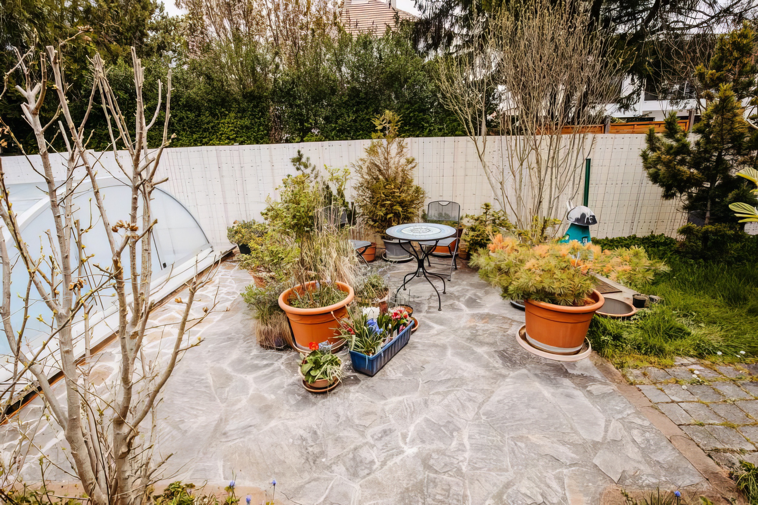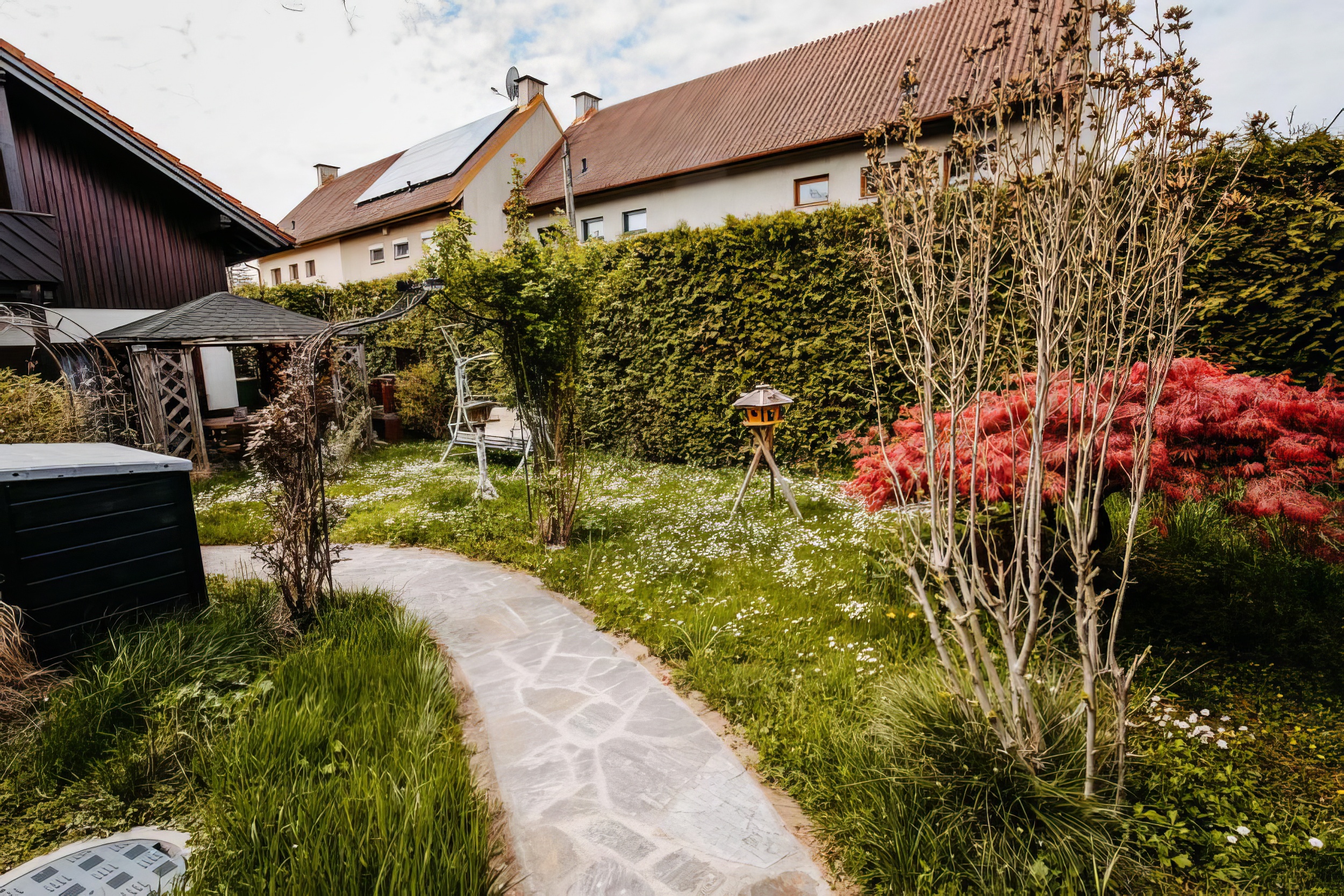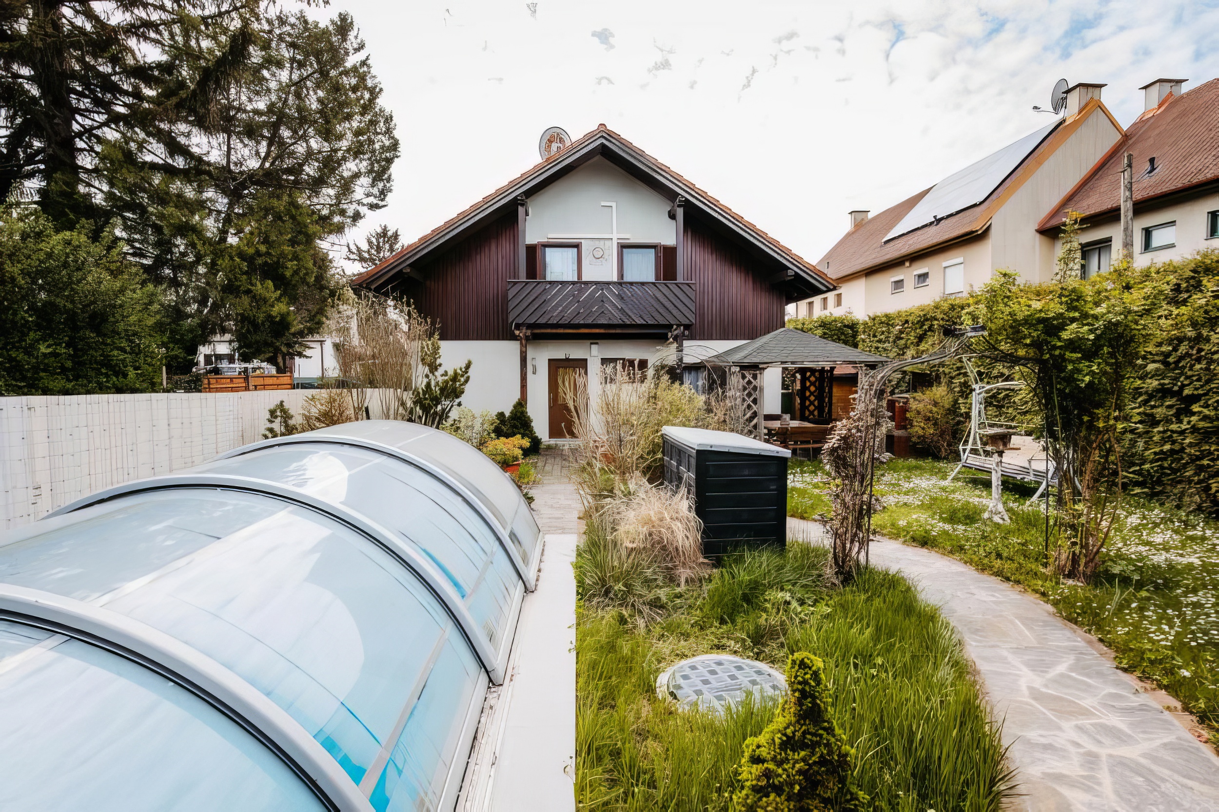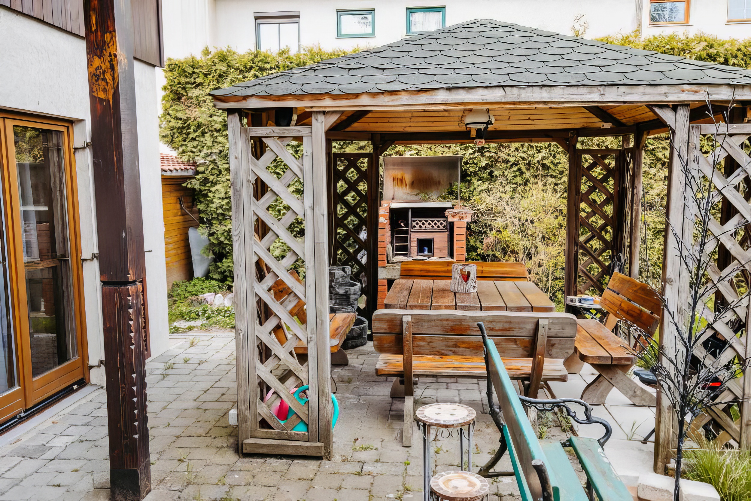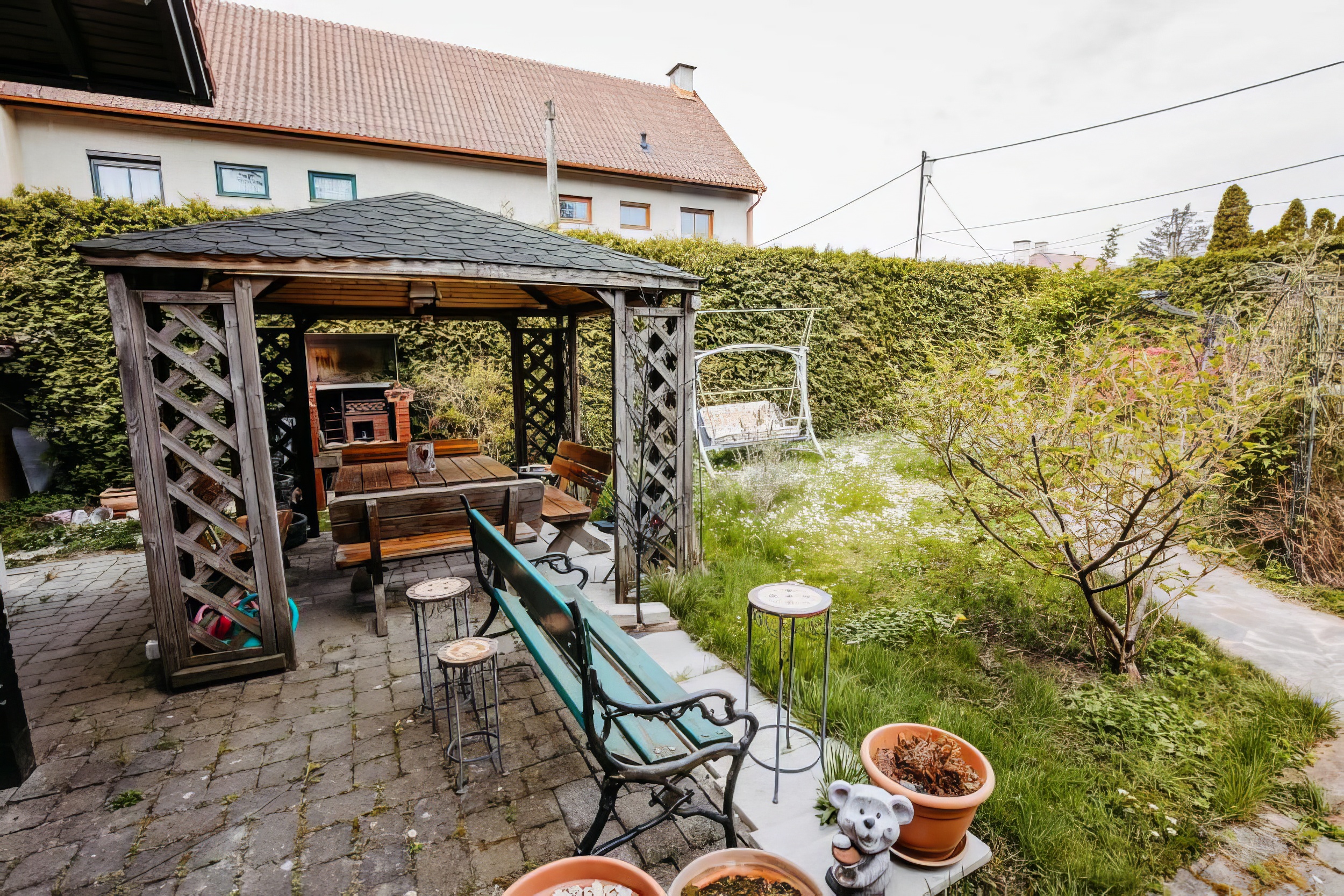 Garten mit Pool und Laube sowie Grillplatz und Brunnen